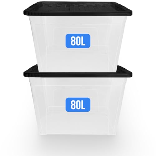 KAPCO Extra Large Storage Boxes with Lids – 80L Durable Plastic Storage Container with Black Lid, Stackable Heavy-Duty Tub for Home, Garage, Kitchen, Toy Organiser, Clothes, Craft (2 Pack) | 80 Litre