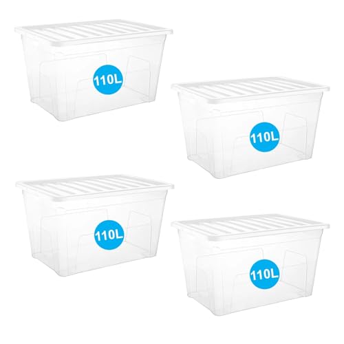 RelianceUK 4 X 110L Extra Large Plastic Storage Boxes with Lids | Clear Strong Storage Box for Clothes Shoes Garage (110 Litre / 4 Pack) Stackable Heavy Duty Tubs | Home Office Big Containers