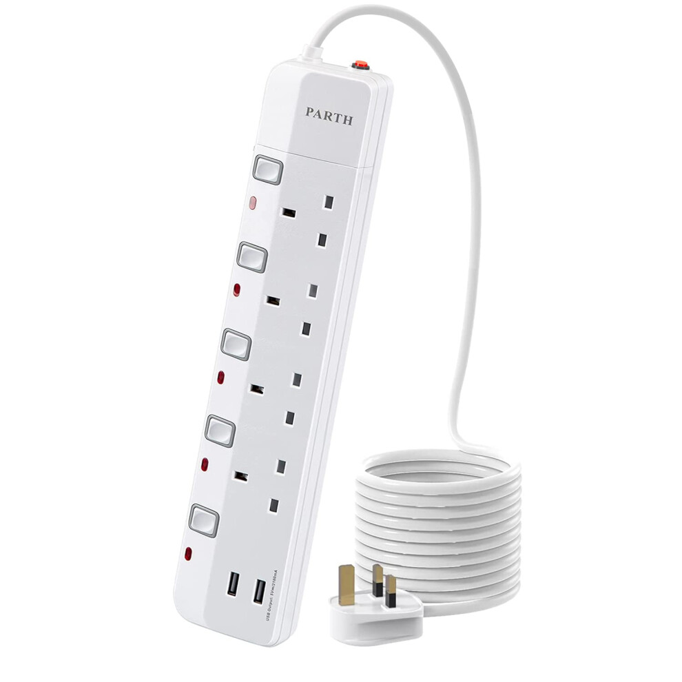 PARTH 5M Surge Protected Extension Lead with USB Slots - 5 metres Extra Long Cord Extension Plug - 1 Fast Charge USB C, 2 USB-A Port Extension Socket