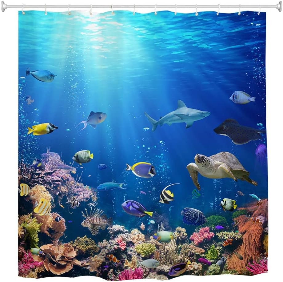 Extra Long Shower Curtain 240 drop, Under Ocean Fish Anti Mould Fabric Waterpro