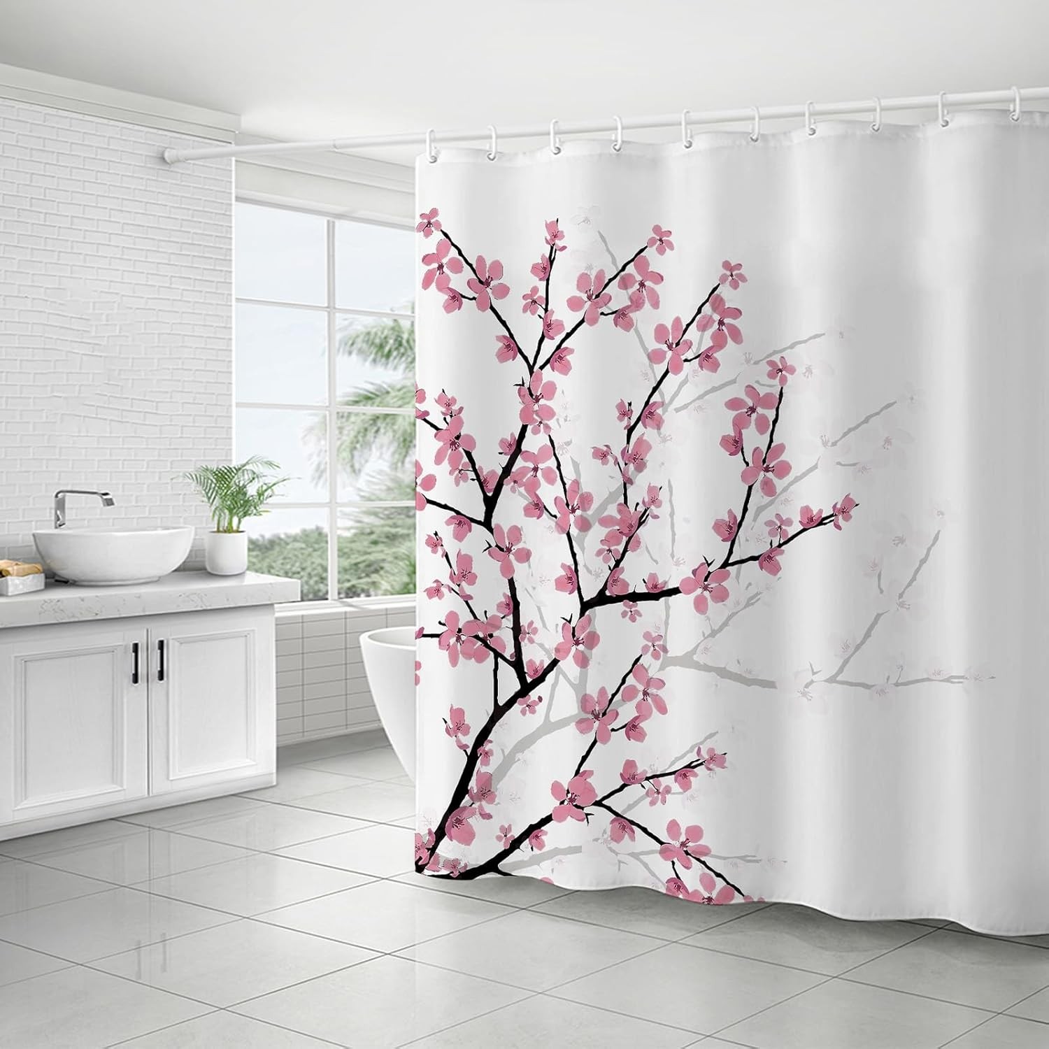 LIVETTY White Bird Extra Long Shower Curtain 180cm × 200cm Drop Floral Butterfly Fabric Bathroom Mould Proof Spring Washable Shower Curtain With 12 Hooks