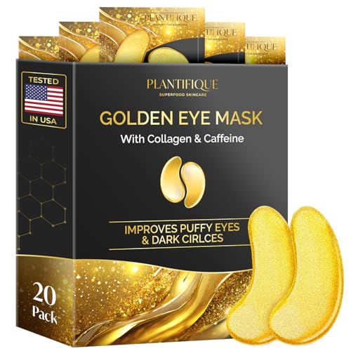 Plantifique Under Eye Gel Patches, 20 Pairs Gold Under Eye Patches for Dark Circles with Collagen & Caffeine, Cooling Eye Mask for Puffy Eyes and Bags, Gel Eye Pads, Under Eye Masks Skincare
