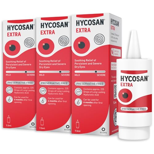 Hycosan Extra - Eye Drops with Hyaluronic Acid for Soothing Relief of Severe and Persistent Dry Eyes - Contact Lens Compatible - Preservative Free - 3 x 225 Measured Doses