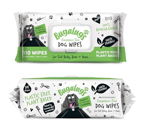 BUGALUGS Dog Wipes, 100% Plastic Free Biodegradable pet wipes for full body, eye wipes, ear wipes, bum & paws. 110 sensitive dog grooming wipes for dogs, puppy & cat grooming (Fragrance Free)