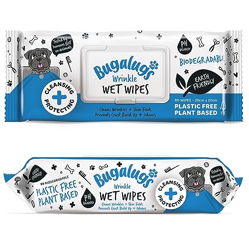 BUGALUGS Wrinkle Dog Wipes for pawly skin - 80 Biodegradable dog grooming pet wipes. Use as Dog ear wipes, dog eye wipes, dog face wipes, Paw & Bum wipes for puppy, dogs & cat grooming