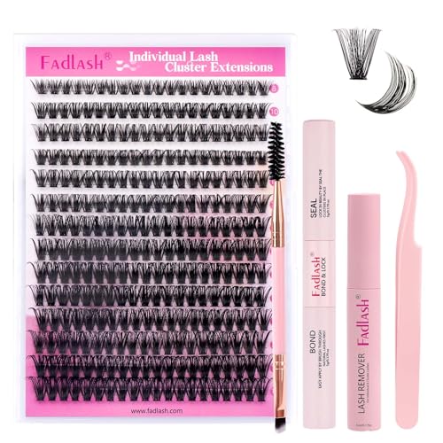 Fadlash Eyelash Extension Kit 0.07 D 8-16mm 200D Wispy Lashes Cluster Lashes Glue Bond And Seal With Tweezers&Eyebrow Brush Eyelash And Lash Adhesive Remover DIY At Home