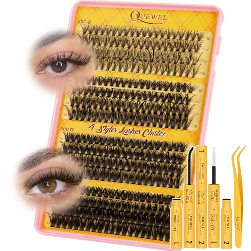 QUEWEL Clusters Lashes Kit 320 Pcs Individual-Lashes Kit, Lash-Clusters Bond and Seal Waterproof, Eyelash Clusters Applicator with Cluster-Lashes Glue Remover at Home (QD-30D-kit)