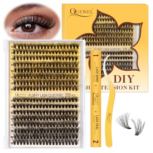 QUEWEL Cluster-Lashes-Kit, 320PCS Lash Extension Kit Mixed Length 10-16mm, Thick Eyelash Clusters with Bond And Seal and Lash Tweezers, Easy DIY at Home(30+40+50+60D KIT)