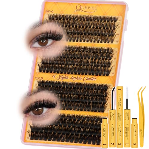 QUEWEL Cluster-Lashes-Kit, 320PCS Lash Extension Kit Mixed Length 10-16mm, Thick Eyelash Clusters with Bond And Seal and Lash Tweezers, Easy DIY at Home(60+70+80+100D KIT)