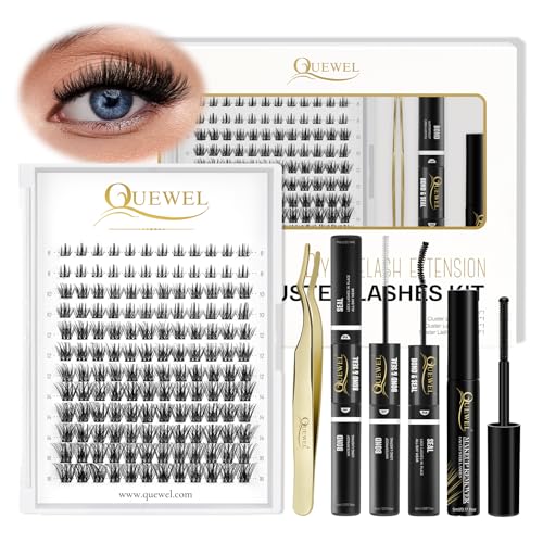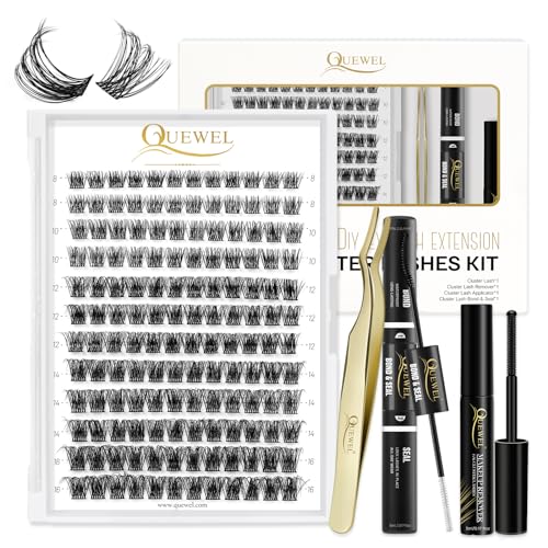 QUEWEL DIY Cluster-Eyelash Extensions Kit, Individual-Eyelashes Mix 8-16mm 144 Clusters,Super Cotton Thin Band, Eyelash Lash Applicator, Cluster Lashes Bond and Seal Super Hold(QU-H-DH-01)