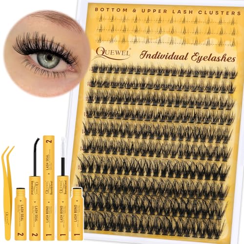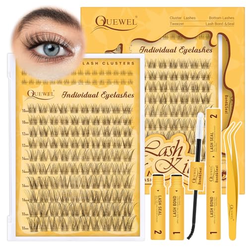 QUEWEL Eyelashes-Individual Kit Natural Cluster-Lashes Mix 10-18mm Individual Eyelashes with Bottom Lashes, Wispy Lashes-Cluster Kit with Lash Bond and Seal Eyelash Tweezers (SXJM GJ 50D)