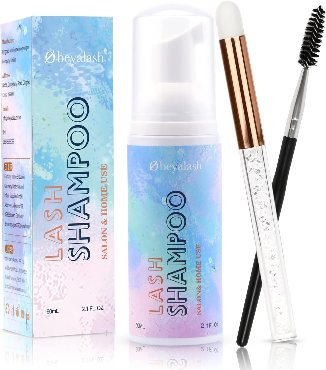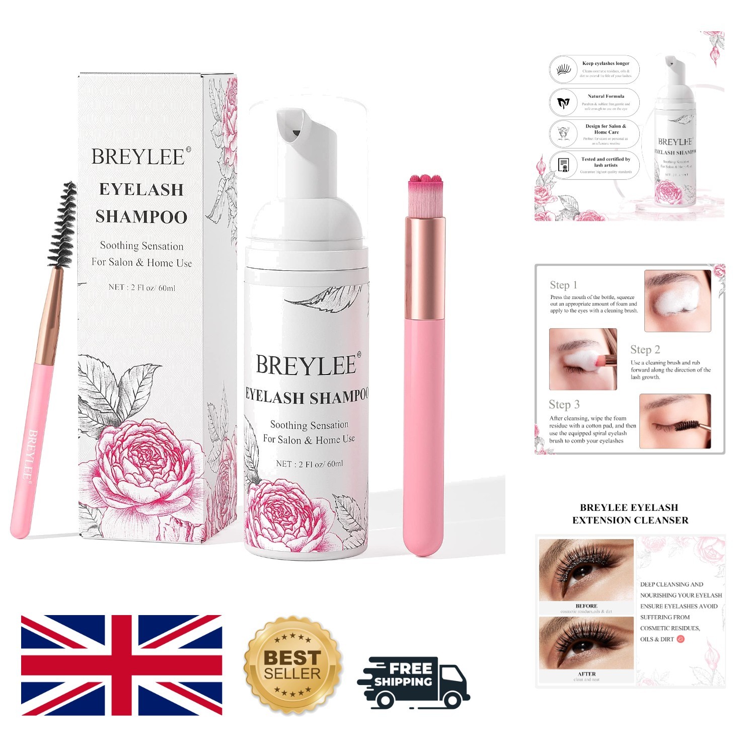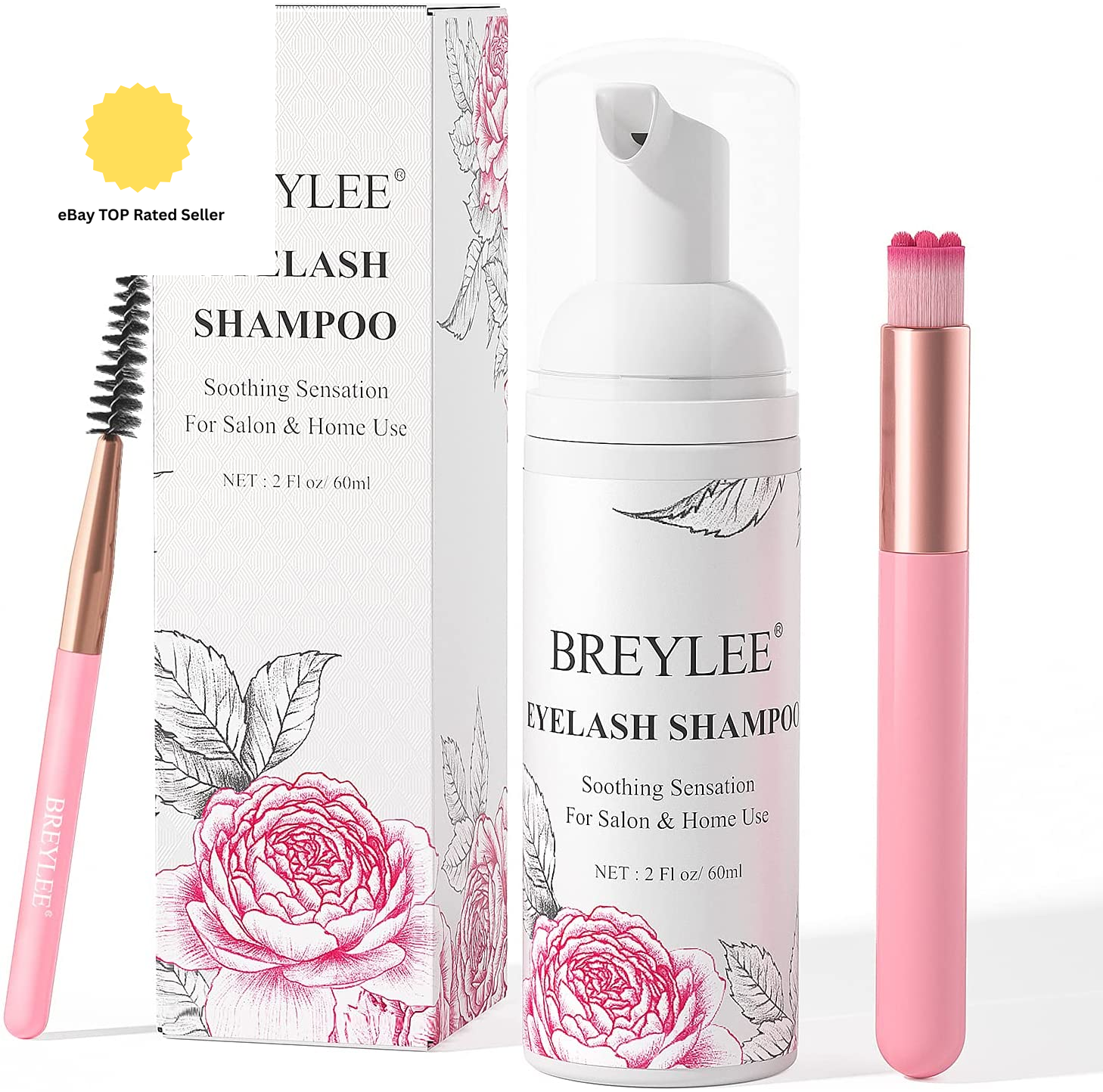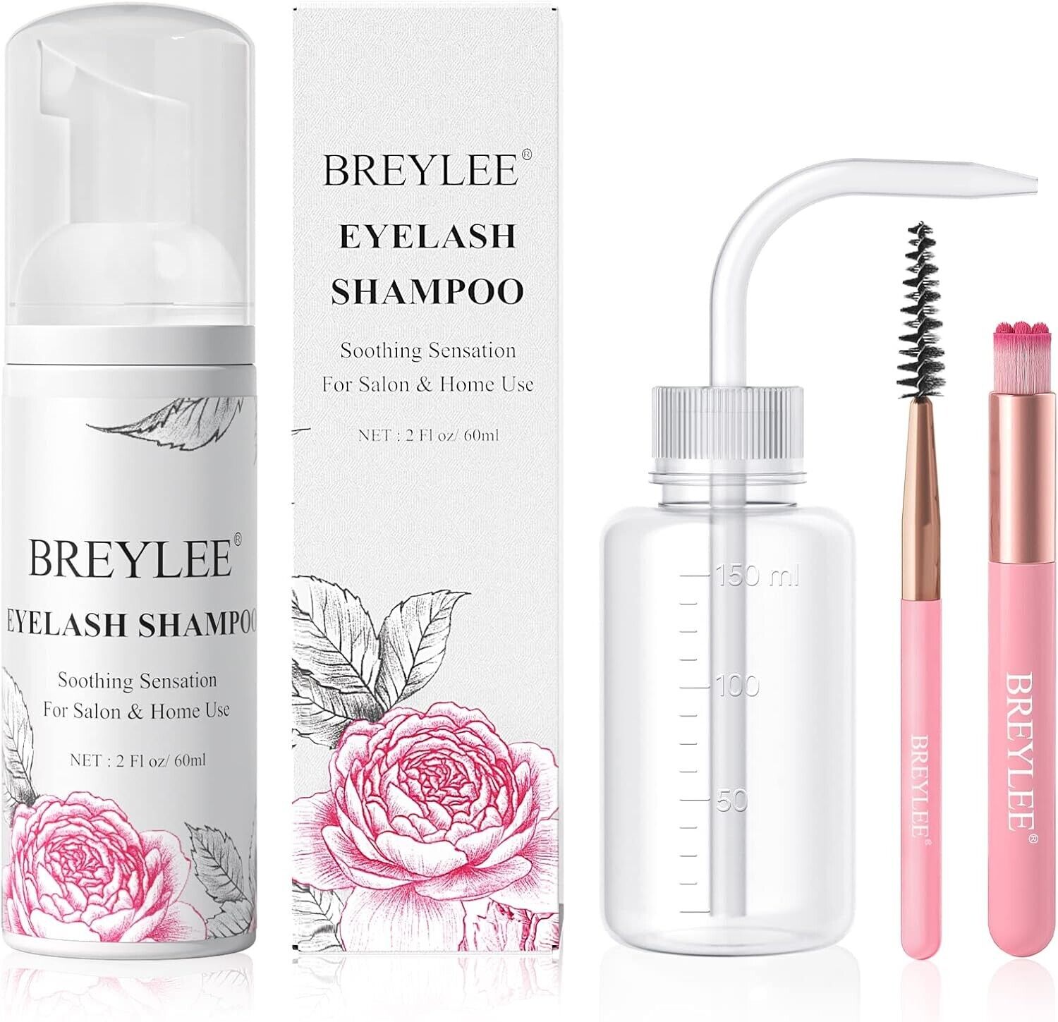 BREYLEE Lash Shampoo, 60ml+Rinse Bottle+Wand+Brush, Eyelash Extension Cleanser for Extensions, Lash Wash, Lash Bath, Lash Cleaner, Paraben & Sulfate Free for Salon and Home Use