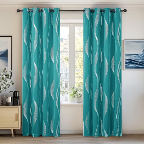 Deconovo Eyelet Curtains Silver Wave Line Foil Printed Blackout Curtains Thermal Insulated Eyelet Curtains for Living Room 52 x 63 Inch Turquoise 2 Panels