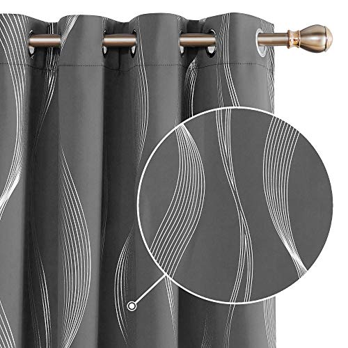 Deconovo Blackout Curtains Silver Wave Line Foil Printed Thermal Insulated Eyelet Curtains for Living Room 66x72 Inch Dark Grey 2 Panels