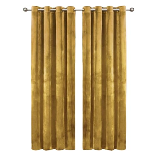 Oxford Homeware Blackout Curtains for Bedroom – Ochre 66x72 Velvet Curtains - Thermal Insulated Eyelet Curtains for Living Room + 2 Tie Backs (168cm x 183cm)
