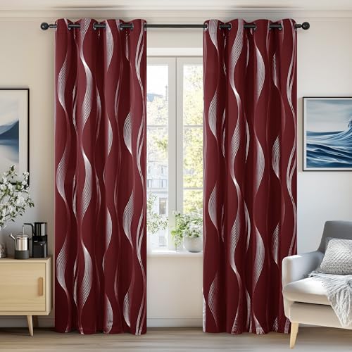 Deconovo Red Curtains Silver Wave Line Foil Printed Blackout Thermal Insulated Eyelet Curtains for Living Room 52 x 72 Inch Red 2 Panels