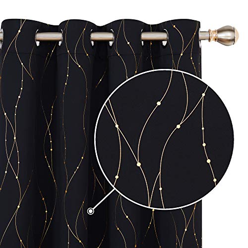 Deconovo Decorative Gold Dotted Line Foil Printed Blackout Curtains, Thermal Insulated Curtains, Eyelet Curtains for Living Room, 52 x 84 Inch(Width x Length), Black, 2 Panels