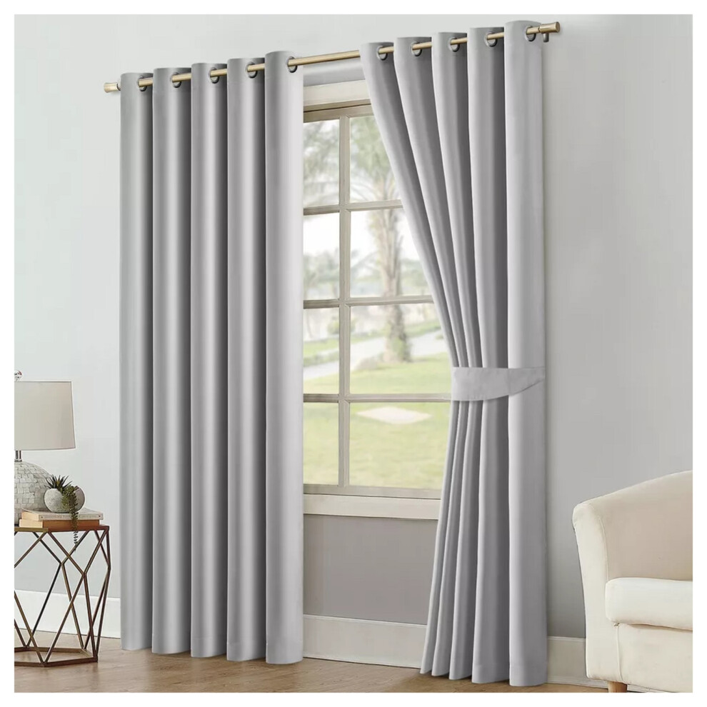 (Silver, 46'' x 54'' (PAIR)) BLACKOUT EYELET CURTAINS READY MADE PAIR+2 TIEBACK