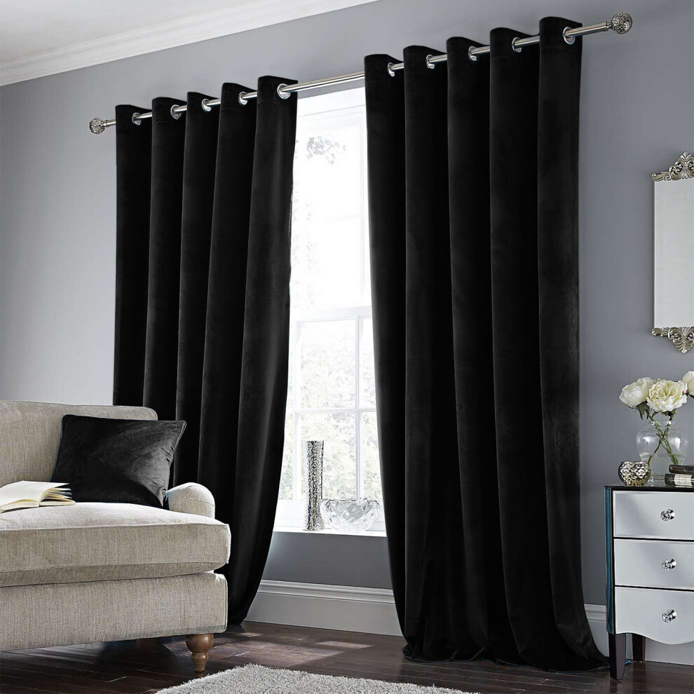 (BLACK, 46 x 54) Soft Velvet Curtains Eyelet Ready Made Fully Lined