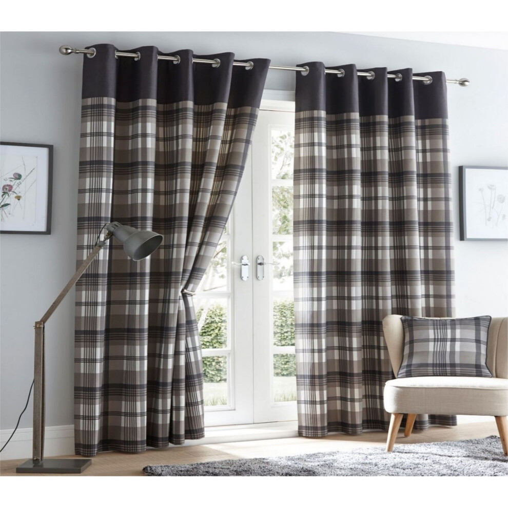 Tartan Checked Grey Eyelet Curtains Fully Lined Ready Made Ring Top 66 x 90"