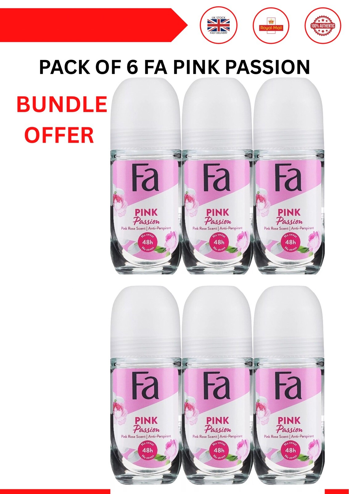 FA PINK PASSION ROSE DEODORANT ROLL ON 50 ML -6 PACK Free P&P