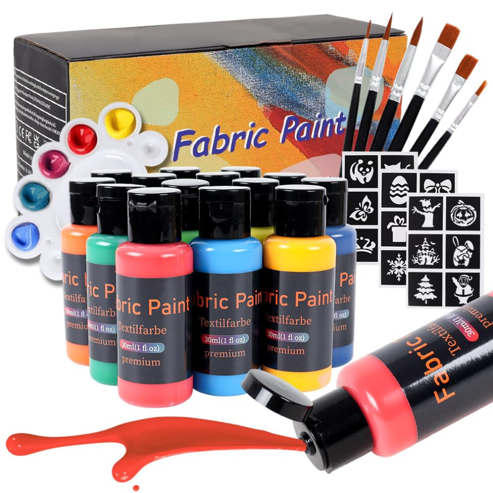 Shuttle Art Fabric Paint Permanent for Clothes, 18 Colours Fabric Paints in Bottles (60ml/2oz) with Brushes, Palette, Stencils, Non-Toxic Textile
