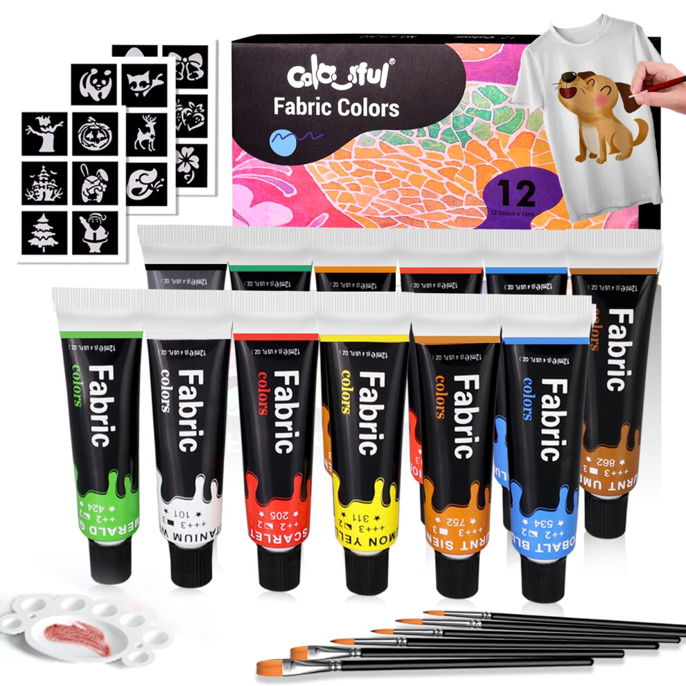 Colorful Fabric Paint Set for Clothes 12 Colors - Permanent Textile Paint Kit for Shoes, Canvas - Non-Toxic Slick Painting Set for Adults, Beginner & Artists