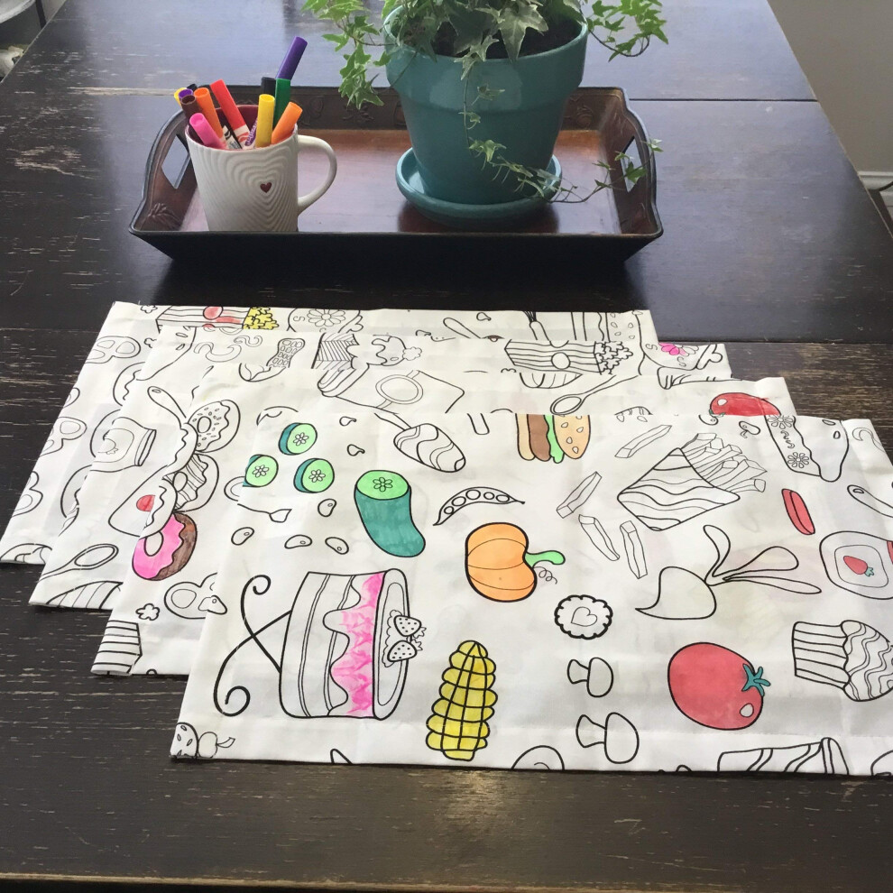 The Coloring Table - Food Fun Design - Set of 4 Placemats (14""""x18"""") - Fabric Coloring Placemats - Colorable Designs - Washable and Reusable - C