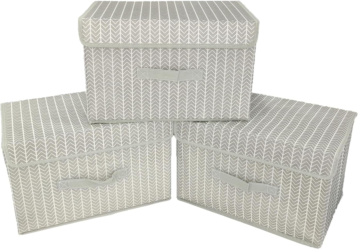3 Pcs Fabric Foldable Storage Boxes with Lids (2 Size), Grey Collapsible Storage Bins with Handles for Toy, Books, Bedroom Closet Office Living Room
