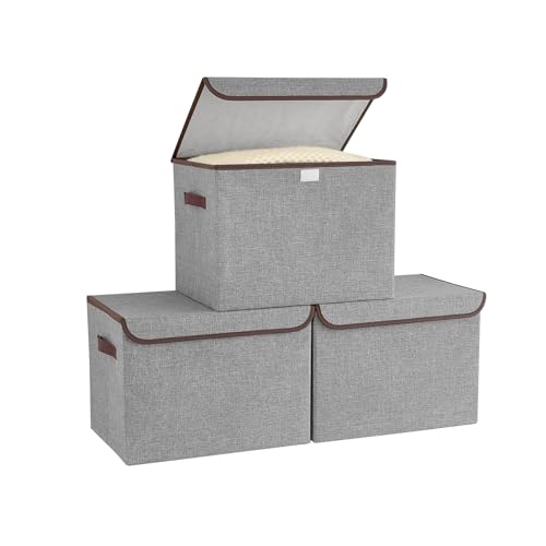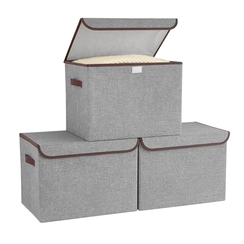GhvyenntteS Storage Bins with Lids (3-Pack), Large Storage Baskets with Lids and Label, Foldable Fabric Storage Boxes with Lids and 3 PU Handles for Home Bedroom Office (Grey, 15" x 11" x 9.7")