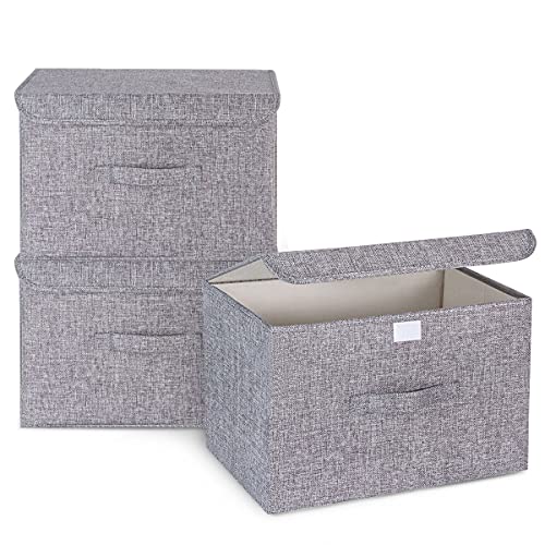 Large Fabric Storage Boxes with Lids [3 Pack], Foldable Linen Fabric Large Storage Baskets for Organising Clothes and Toys (Slate Grey, Large - 3 Pack