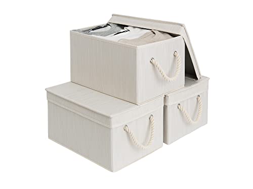 StorageWorks Fabric Storage Boxes with Lids, Foldable Storage Basket for Wardrobe Organising Clothes, Large Storage Bins with Lids and Soft Rope Handles, Mixing of Beige, White & Lvory, 3-Pack