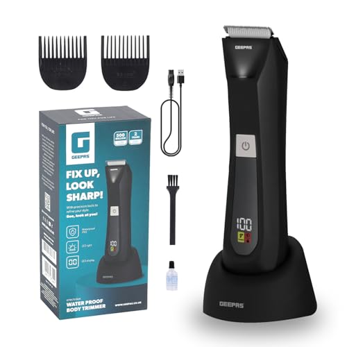 GEEPAS Full Body Trimmer | Waterproof Wet & Dry Shaver for Face Groin Chest Top to Bottom | 600mAh Rechargeable IPX5 Ceramic Blade Smart Display LED Light 2 Speeds 90 Min Run Time | 2 Year Warranty