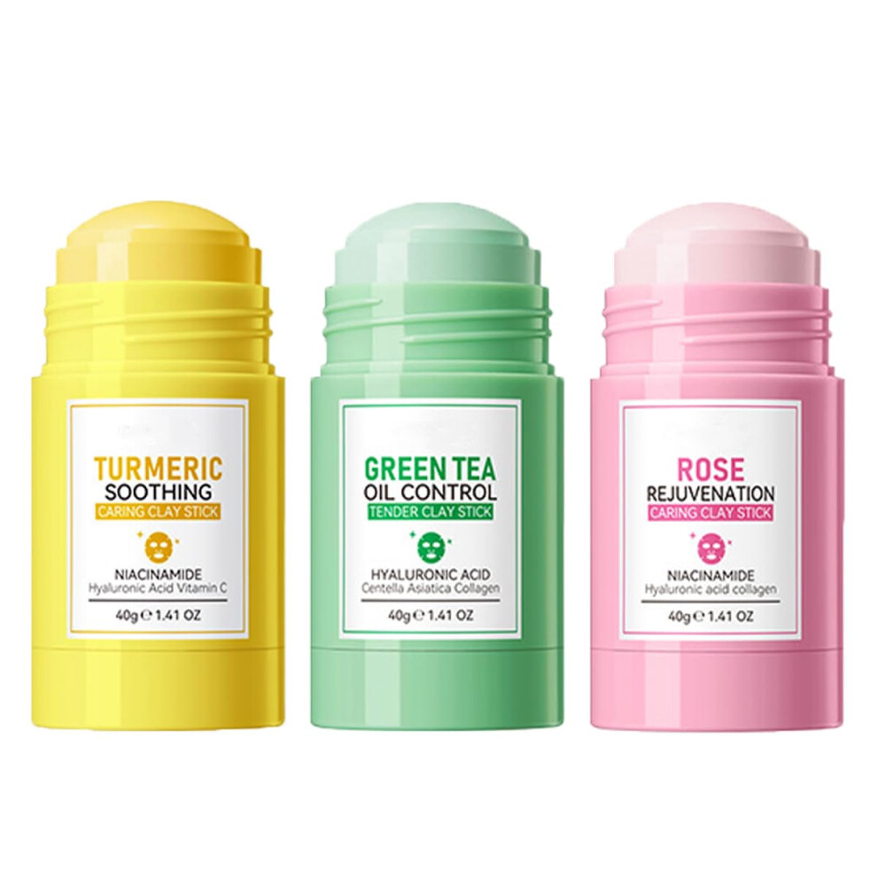 3PCS Green Tea Turmeric Rose Face Mask Stick Set Deep Cleansing Clay for Blackheads Oil Control
