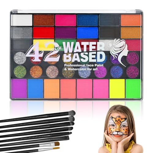 Face Painting Kit, 42 Colours Face Paint Kit, Face Paints for Children and Adults, Safe, Non-Toxic, Washable, Matte & Glitter Body Paint for Halloween, Parties, Festivals with 8 Brushes