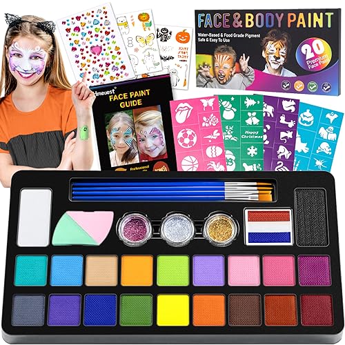 Face Painting Kit, 20 Colors Face Paints for Children, Non-Toxic & Washable Face Piant for Halloween Make Up, Including Glitter, Stencil, Tattoo for Kids - Unique Gift