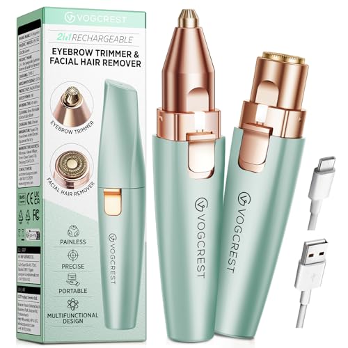 VG VOGCREST Eyebrow Facial Trimmer: 2 in1 Rechargeable Facial Hair Removal and Eyebrow Shaver - Face Lips Body Painless Facial Razor with Built-in LED Light (Green)
