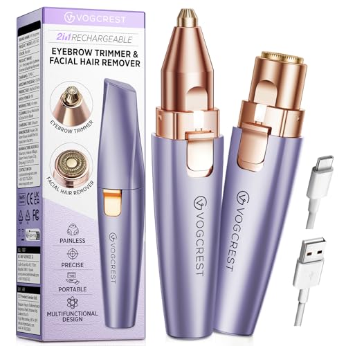 VG VOGCREST Eyebrow Facial Trimmer: 2 in1 Rechargeable Facial Hair Removal and Eyebrow Shaver - Face Lips Body Painless Facial Razor with Built-in LED Light (Purple)