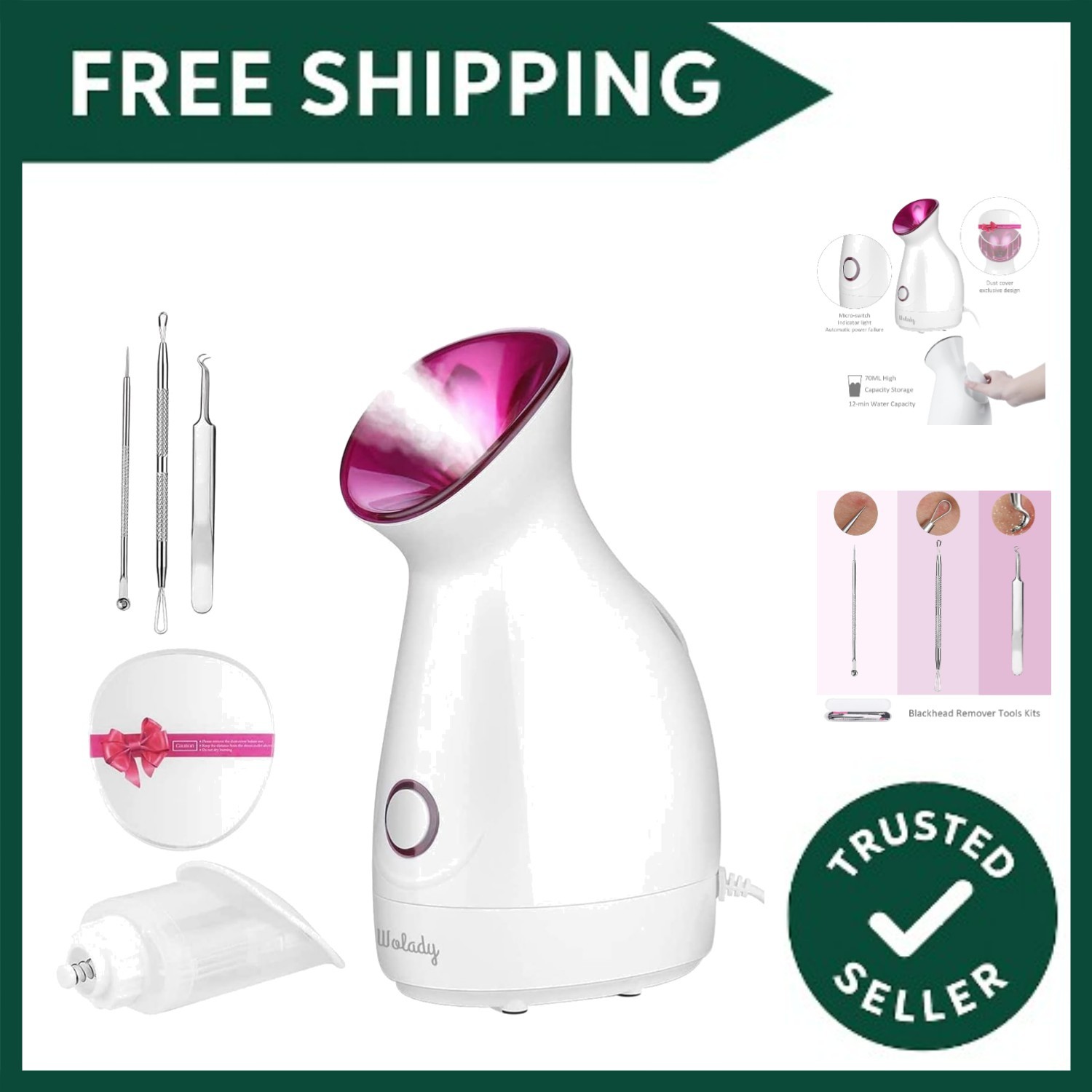 Pink Nano Ionic Face Steamer - Moisturizing Spa Device with Bonus Extractor Kit