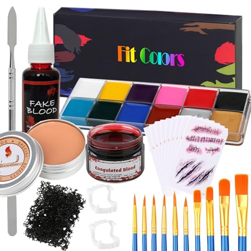 Halloween Makeup Special Effects Oil Face Body Paint with Scar Wax, Face Paint Brush, Spatula Tool, Fake Blood, Scar Tattoo Stickers, Sponge Oil-Based Face Paint SFX Cosplay