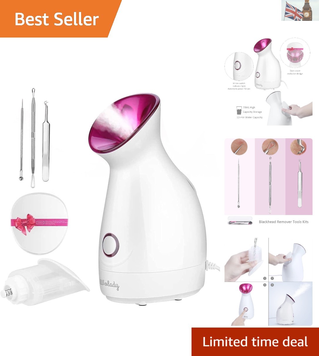 EZBASICS Face Steamer Professional, Nano Ionic Facial Steamer for Pores with Warm Mist Humidifier Atomizer and Sauna Inhaler Spa, 1-Pack + 5-Pack Stainless Steel Skin Kit Pink