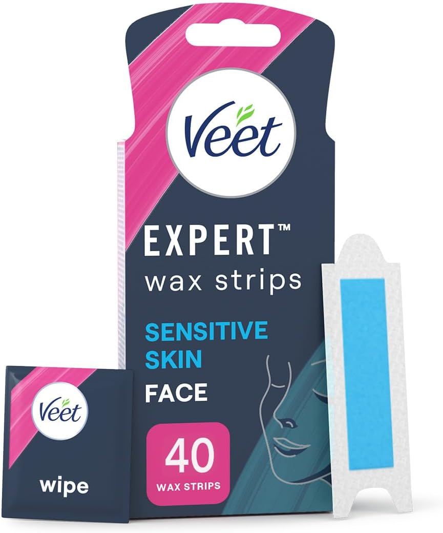 Veet Expert Facial Wax Strips for Women, 40 Count + 4 Finish Wipes, Sensitive Sk