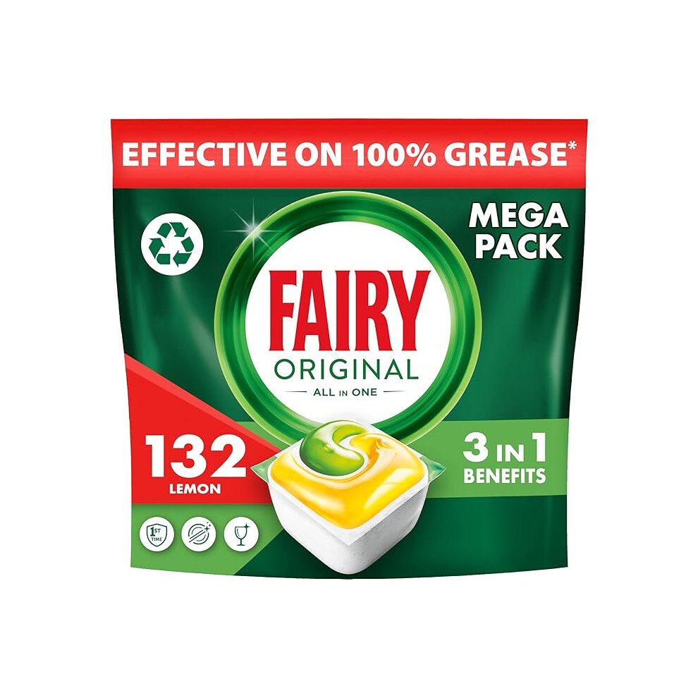Fairy Original All In One 132 Dishwasher Tablets, Lemon, Effective Even On Dried-On Grease