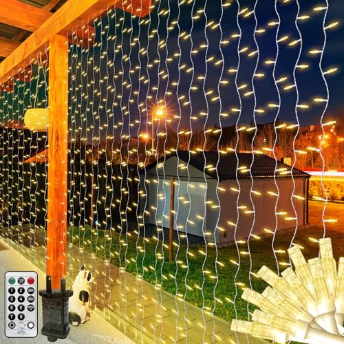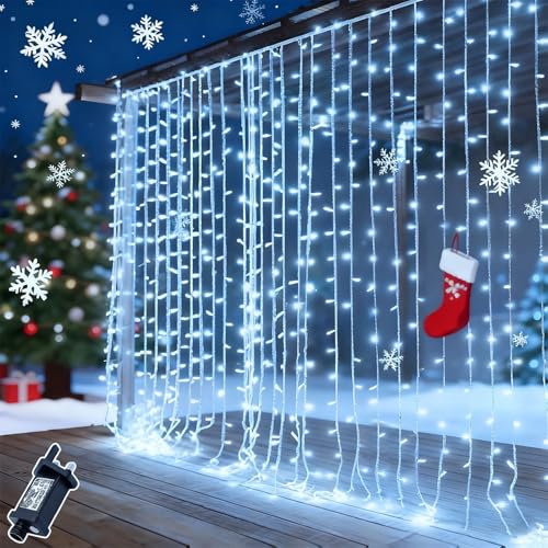 Dekofun 600 LED Curtain Fairy Lights 6m x 3m Hanging Gazebo Light Mains Powered with Timer, 8 Modes Waterproof Christmas Window Lights, Waterfall Light for Xmas Indoor Outdoor Decorations - White