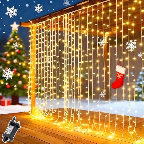 Dekofun 600 LED Curtain Fairy Lights 6m x 3m Hanging Gazebo Light Mains Powered With Timer, 8 Modes Waterproof Christmas Window Lights, Waterfall light for Wedding Wall Xmas Indoor Outdoor Decorations