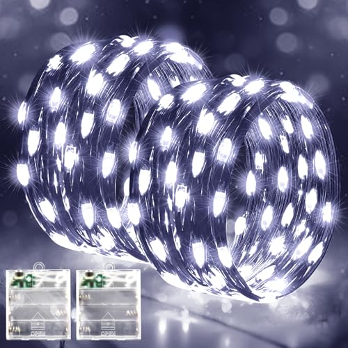 Fairy Lights, (2pcs White) Set of 5M 50LED Battery Operated Fairy Lights, Indoor Outdoor Copper Wire Fairy Lights, Decoration for Bedroom, Garden, Wed