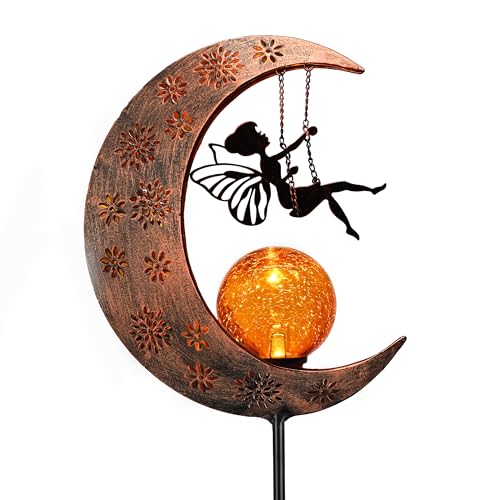 TERESA'S COLLECTIONS Moon Solar Garden Lights, 39 Inch Metal Fairy Garden Decor for Outside with Crackle Glass Ball, Angel Outdoor Lights Decorative Stake Lawn Ornaments Yard Art for Patio Decoration