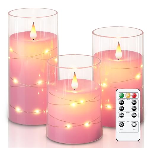 Homemory Flameless Candles Flickering with String Lights, Fairy Lights LED Candles, Electric Candle with Remote Control and Timer, Battery Operated Candle, Pink, Acrylic, Set of 3