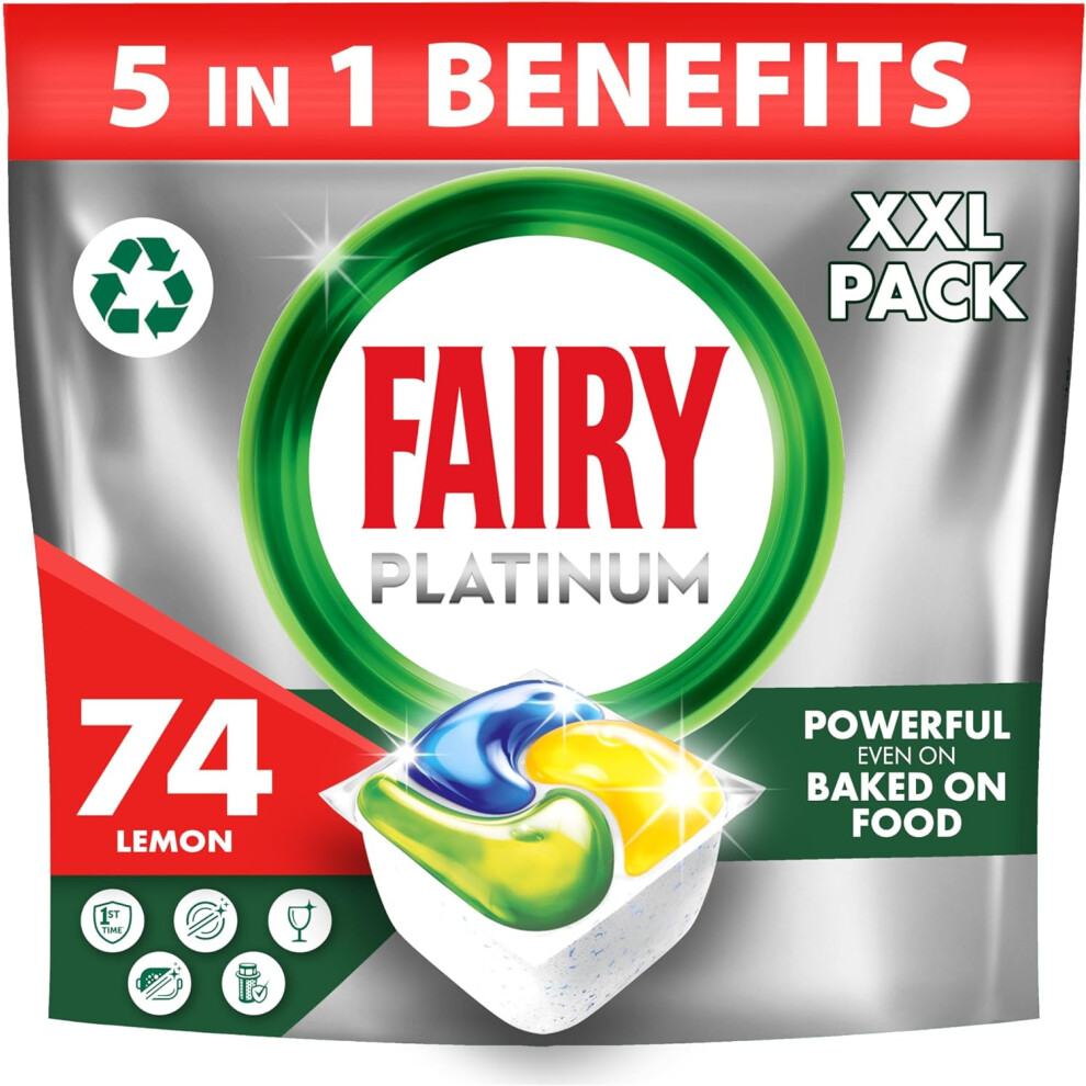Fairy Platinum Plus All-In-1 Dishwasher Tablets, Bulk Pack- 74 Pods, Lemon, With Greasy Filter & Rinse Aid Action