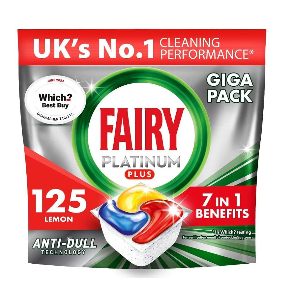 Fairy Platinum Plus All-in-1 Dishwasher Tablets, 125 Pack, Lemon. With anti-dull tech & rinse aid action for a deep clean. Effective in short cycles f